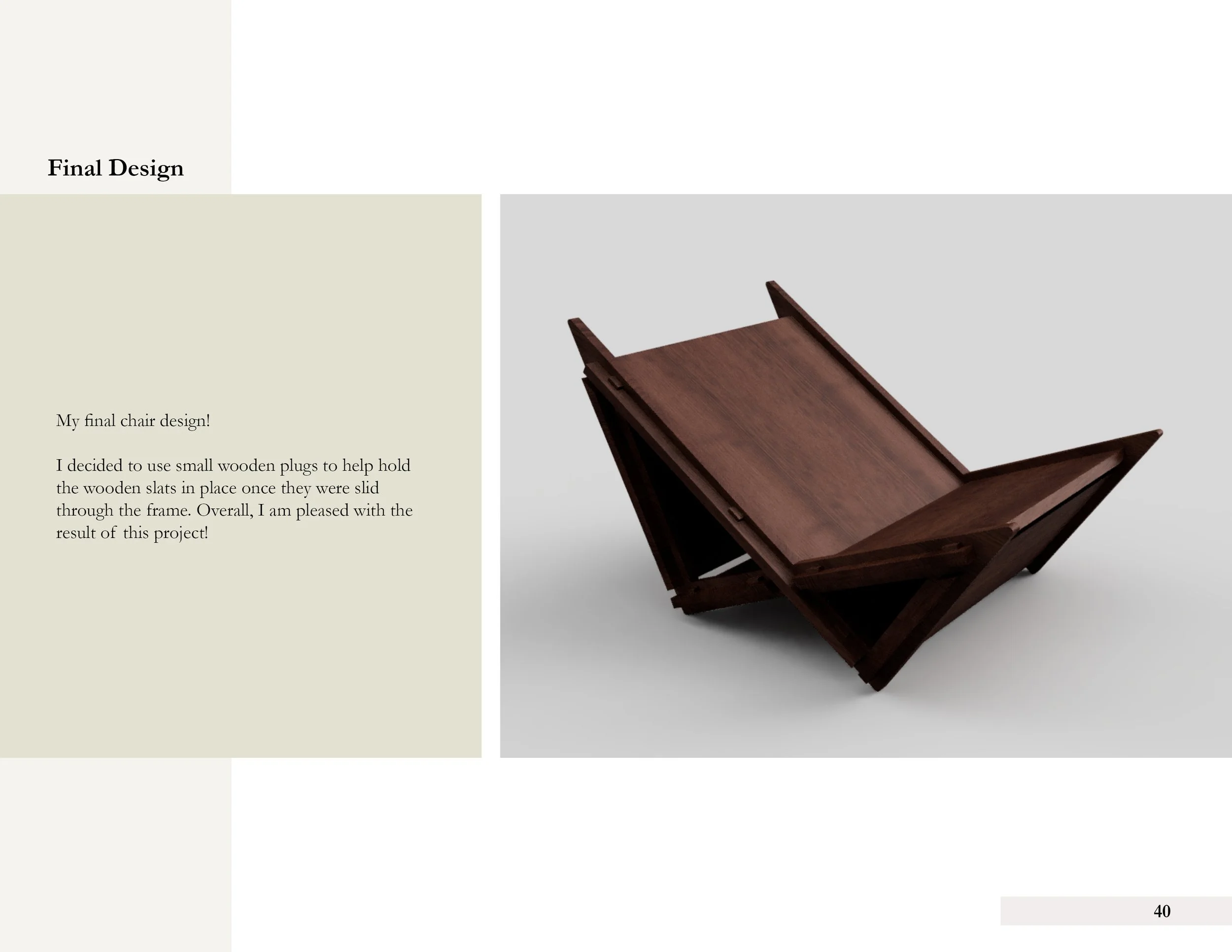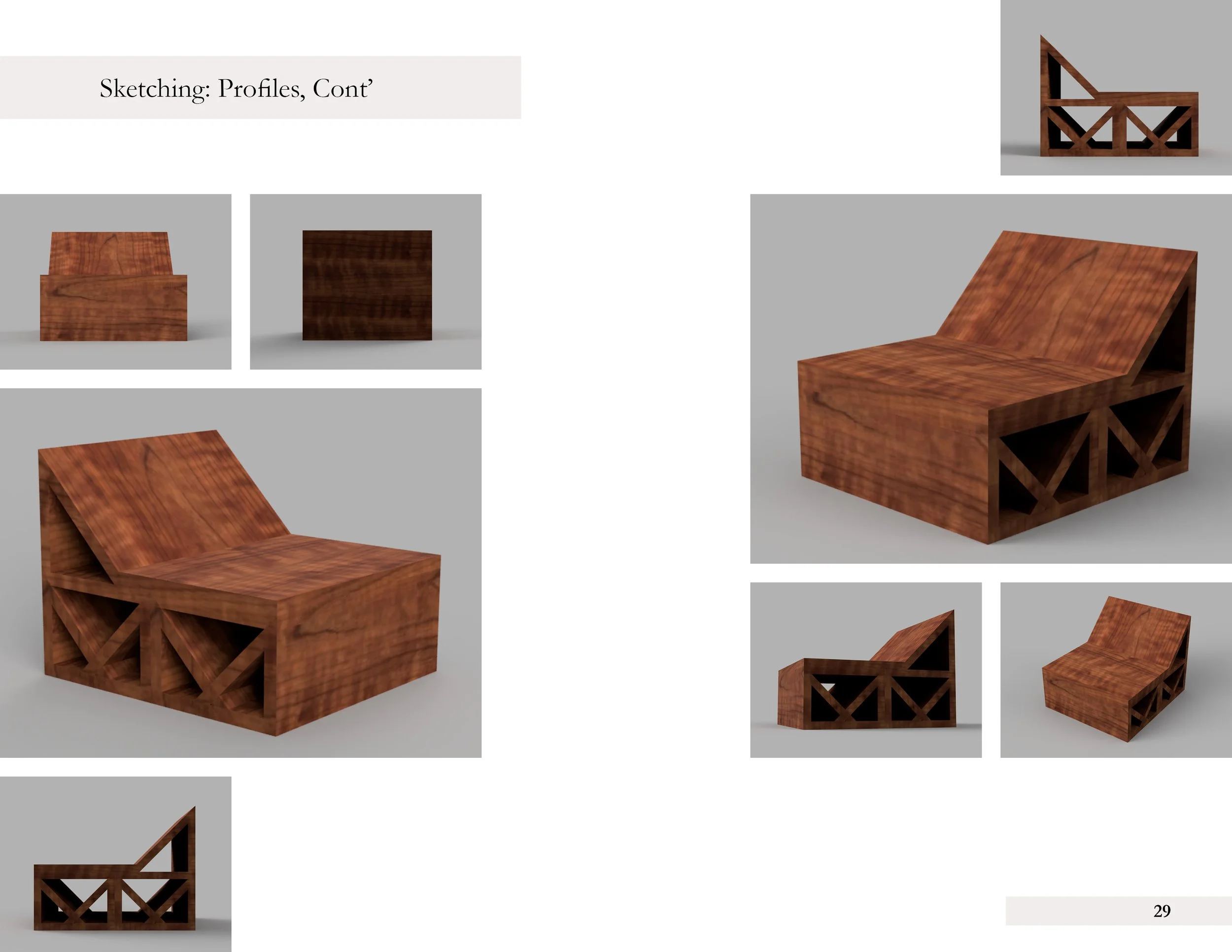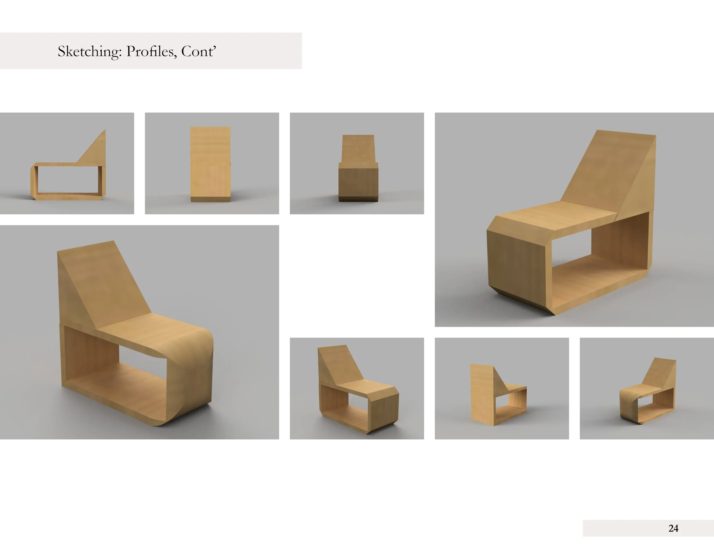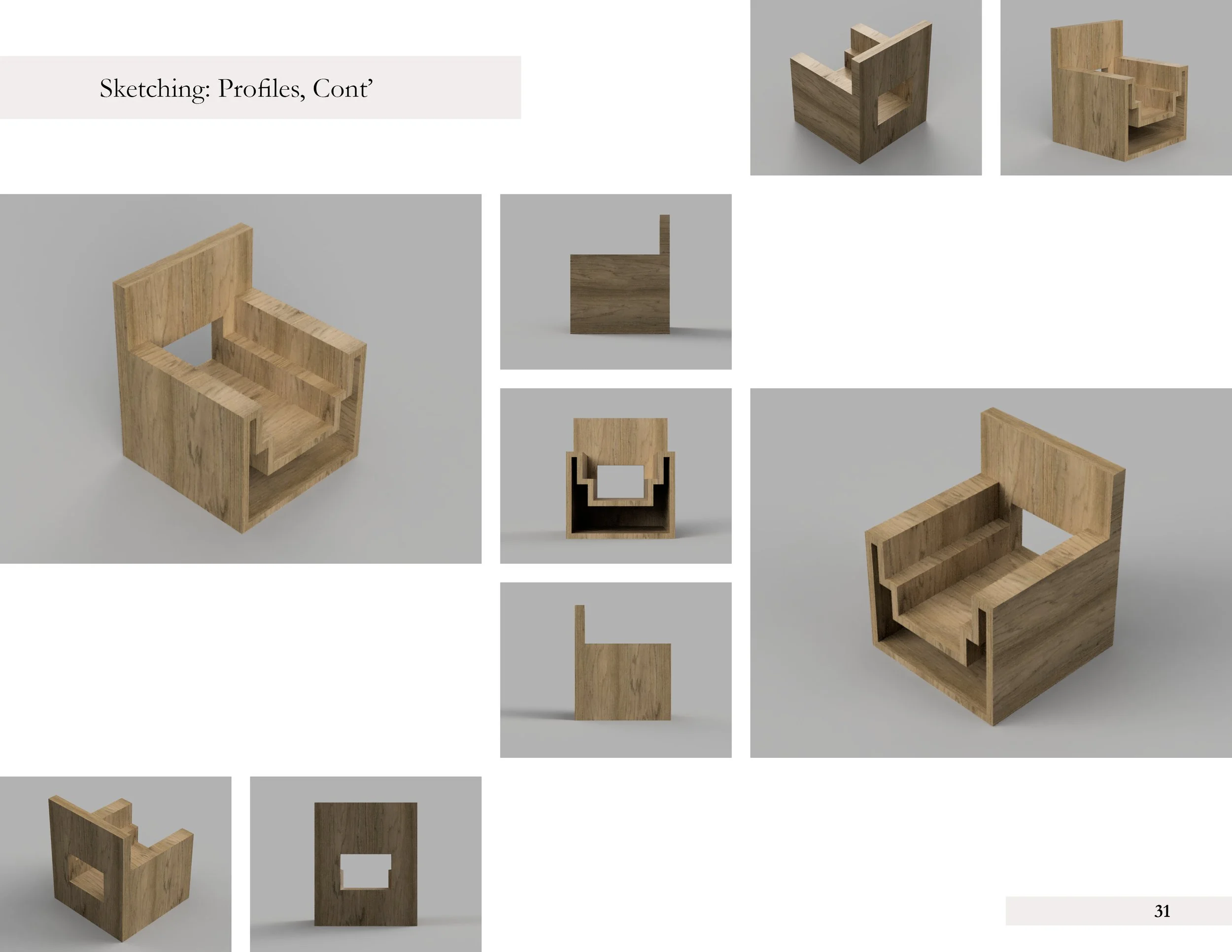 I wanted to design a chair that was as interesting to look at as it was functional. This final design includes ample amounts of storage space and has a dramatic silhouette to draw in attention from anywhere in a room.