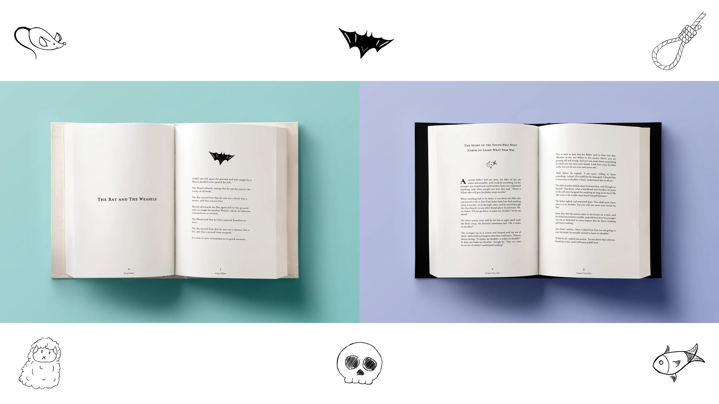 To achieve this goal, I created sleek and modern covers for the books, structured the typesetting on the interior, and created illustrations for each of the stories I used for my layout.
